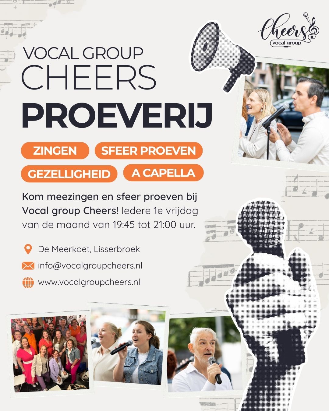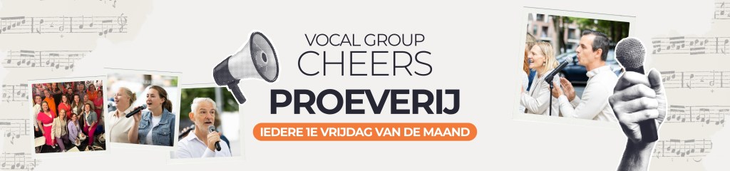 Kom meezingen en sfeer proeven bij Vocal group Cheers! Iedere 1e vrijdag van de maand van 19:45 tot 21:00 uur. Meld je aan via de mail.
